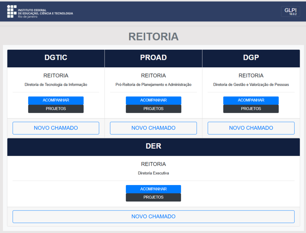 4. No caso da Reitoria, para serviços de e-mail, na sessão da DGTIC, clique em NOVO CHAMADO